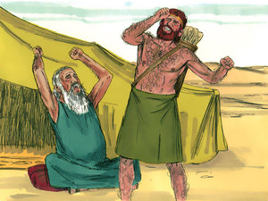(freebibleimages.org) Rebekah's plan is carried out with skins and garments of goats. Jacob's deception would turn on him when his sons dip the garment of Joseph, his favorite son, in the blood of a goat to make him think Joseph has been killed by a wild animal (27:16; 37:31-33). “Although Jacob got the blessing he wanted, deceiving his father cost him dearly. These are some of the consequences of that deceit: 1) he never saw his mother again; 2) his brother wanted to kill him; 3) he was deceived by his uncle, Laban; 4) his family became torn by strife; 5) Esau became the founder of an enemy nation; 6) he was exiled from his family for years.” –NIV Life Application Study Bible