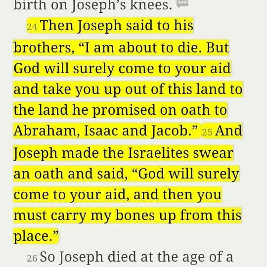 With the confidence that God would carry out His covenant promises, Joseph also requests that he be buried in the promised land. Although his coffin would lay above the ground for over 400 years as God’s people are enslaved in Egypt, the Israelites carry it back to Canaan under Moses’ leadership (Exodus 13:19).