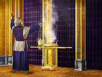 Made out of acacia wood and overlaid with gold, the altar of incense stood the tallest of all the furniture in the Holy Place (a foot and a half square and three feet high). An ornamental gold rim like a crown circled the top with golden “horns” on each corner. The altar stood before the veil that separated the Holy of Holies from the Holy Place. The priest burned incense here, morning and evening, as he trimmed the lamps.
